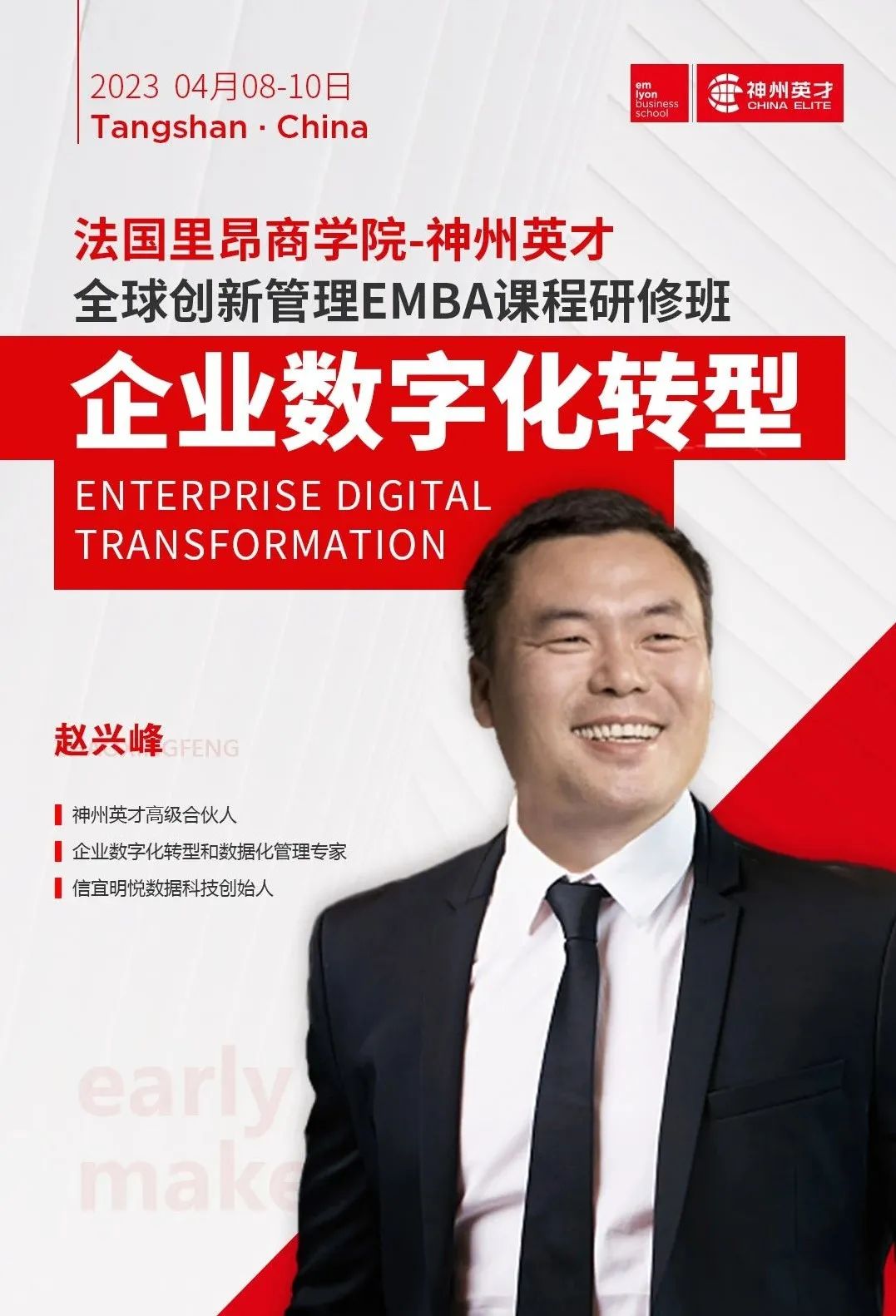 ![]() 課程將圍繞數(shù)字化轉(zhuǎn)型的本質(zhì)與底層技術(shù)邏輯,通過講解企業(yè)數(shù)字化轉(zhuǎn)型常見的陷阱和難題,分析典型場景案例和數(shù)字化轉(zhuǎn)型戰(zhàn)略規(guī)劃方法,帶領(lǐng)學員們走上數(shù)字化轉(zhuǎn)型變革之路。 智能終端越來越普及,顛覆了人們的生活方式。正如趙興峰老師在《數(shù)字蝶變》中寫道:“如果數(shù)字化能夠驅(qū)動本企業(yè)的效率大幅度提升,那么就有了業(yè)務化的可能,就有創(chuàng)造新營收的機會。中小企業(yè)需要做的是開放共享+聯(lián)融創(chuàng)新! 時代的考題已經(jīng)列出,我們的答卷正在寫就! 2023年法國里昂商學院-神州英才全球創(chuàng)新管理EMBA課程研修班游學之旅即將啟程,咱們在河北遷安,不見不散! |