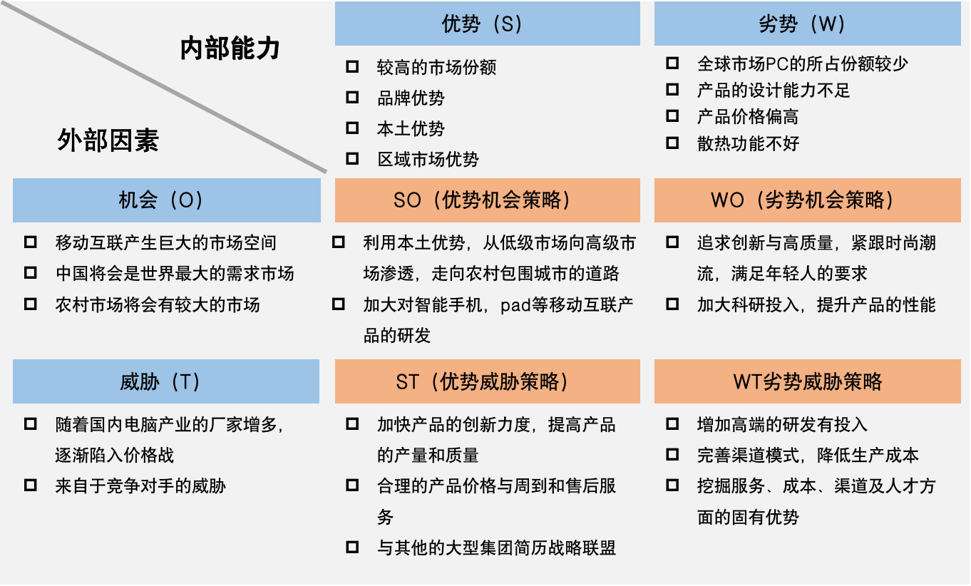 背景:聯(lián)系集團,創(chuàng)立于1984年,F(xiàn)有聯(lián)想及IBM個人電腦事業(yè)部組成。主營業(yè)務(wù)包括臺式電腦、筆記本電腦、服務(wù)器、打印機、掌上電腦、手機等,在對聯(lián)想分析時得出了以下情況和結(jié)論:
